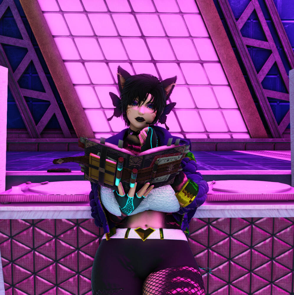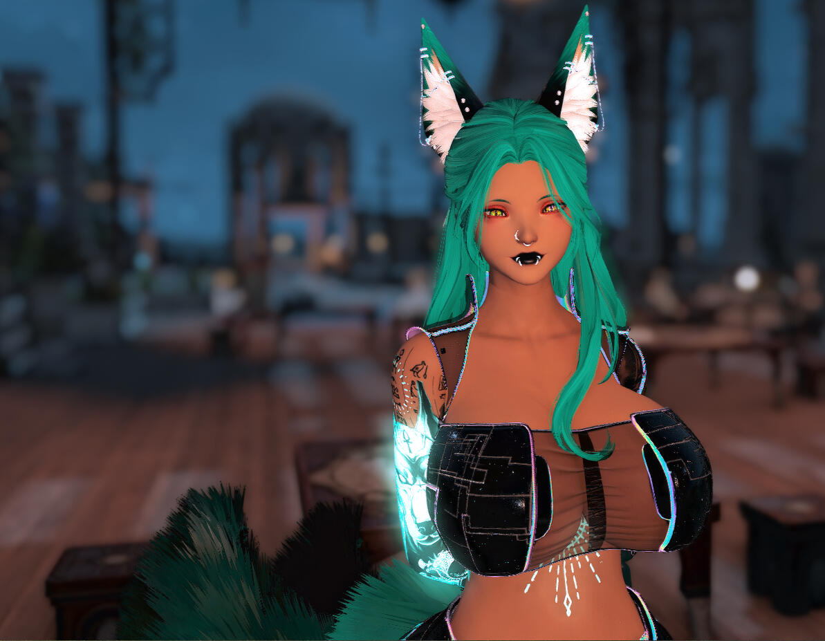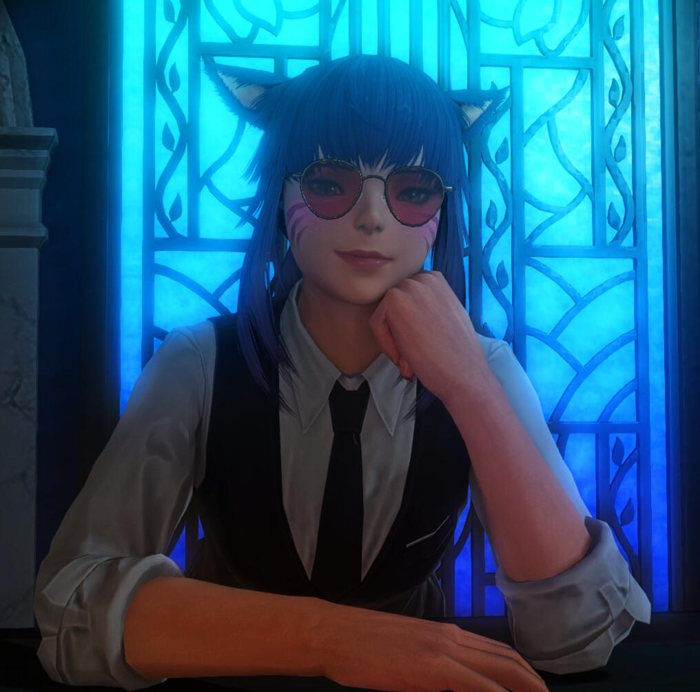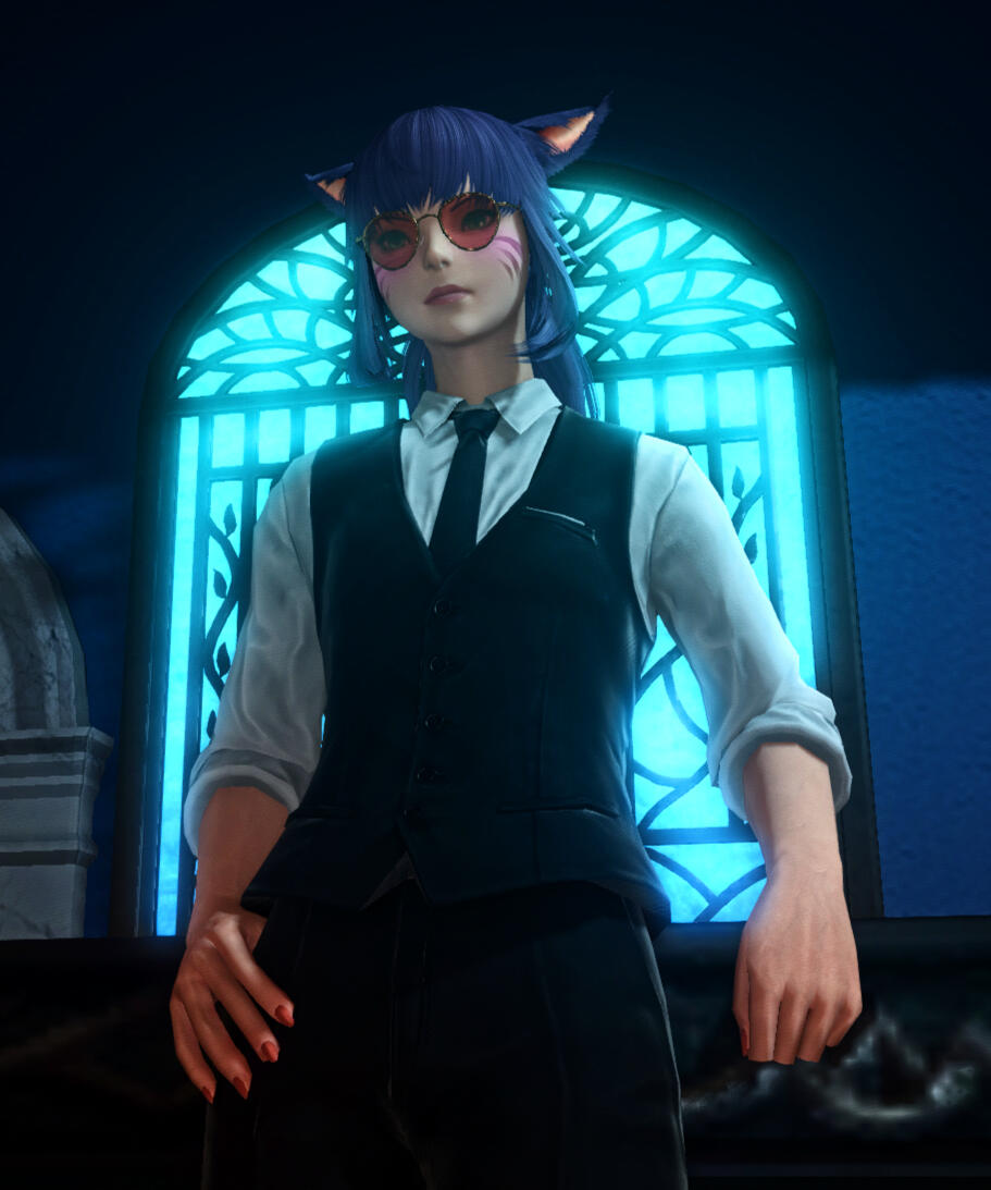 𝐀𝐁𝐎𝐔𝐓 ➜ This calm and collected cat is a heavy drinker, so putting her passion to work behind the bar at Azure is the least she could do. Trained as a Gunbreaker, N'taali is not afraid of a barfight, and might break a bottle over your head if you start something. Friendly but serious, she will make your drinks with care, and promises to not have a sip before serving.